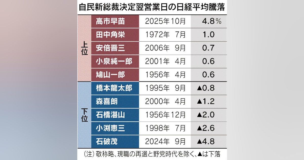 個人的には自民党新総裁決定翌営業日の日経平均騰落という表です。前回の総裁選では高市さんが選ばれるだろうと見越して、事前に買いが入っていたところを石破さんが当選して急落して、今回は小泉さんが優勢だろうと、買い控えが起きていたところを、高市さんが当選して急騰ということで、投資家から、かなりの期待を集めているんだなあと素人のような感想がこぼれました。少し面白いのが石破さんの時が-4.8%で今回が+4.8%ということで偶然だとは思いますが、全くの真逆の結果でしたね。石破さんの後というのも、期待値が伸びた原因になっていそうですよね。